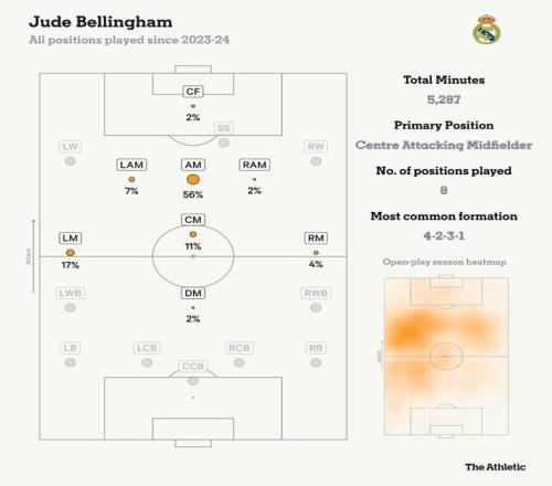 还记得贝林厄姆在2023年首次加盟皇马时,尽管身为中场球员,却在处子赛季打出了职业生涯新高的23粒进球吗?自那以后,他在伯纳乌的情况发生了很大变化。 在俱乐部层面,贝林厄姆本赛季状态不稳,尽管训练场消息人士(如同本文所有引用的消息来源一样,要求匿名以保护关系)指出,他正在从肩部手术中恢复是原因之一。他在七月俱乐部世界杯后接受了该手术,并于九月底复出。他最初的预计回归日期是十月。 尽管如此,贝林厄姆仍需找回状态。阿隆索信任他,在他手术复出后的首场比赛——马德里德比对阵马德里竞技中就让他首发,但在那场2比5的惨败之后,教练连续两场比赛将他放在替补席上——这位英格兰球员对此并不满意。 他打入了3个进球,是在十月连续对阵尤文图斯、巴塞罗那和瓦伦西亚的比赛中取得的。但他在对阵利物浦和巴列卡诺时未能破门,就像他在本赛季前六次出场时一样。即便如此,他每90分钟的进球数(0.41)和预期进球数(0.5)都高于上赛季整体水平,尽管样本量非常小。 阿隆索在几次新闻发布会上表示,希望他踢中场位置,同时不失去在对方禁区的影响力。贝林厄姆则更倾向于踢更靠前的位置,就像他前任教练卡洛·安切洛蒂使用他的方式一样。下图显示了贝林厄姆自2023年加盟皇马以来主要踢攻击型中场,同时在上赛季也出现在左路。