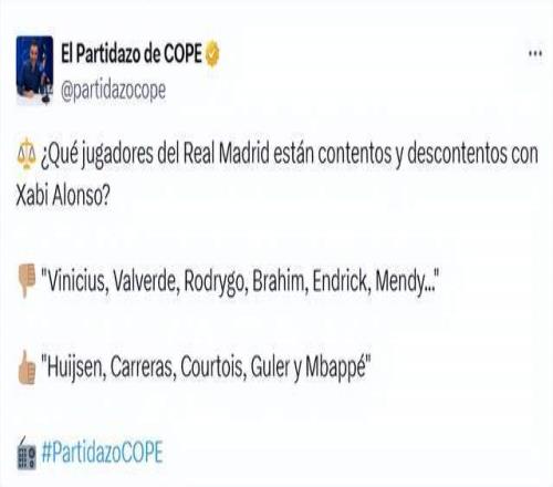 “对阿隆索不满的球员,有维尼修斯、巴尔韦德、罗德里戈、布拉欣-迪亚斯、恩德里克、门迪……” “对自己的角色和教练组感到满意的球员,有赫伊森、卡雷拉斯、库尔图瓦、琼阿梅尼、居勒尔、姆巴佩……”