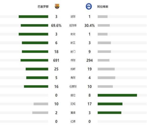 重新回到赛场之后,巴塞罗那继续给阿拉维斯的后防施压,第50分钟拉菲尼亚大禁区前沿迎球怒射,可惜角度太正,皮球被客队门将轻松抱在怀中,第62分钟拉什福德拼抢时摔倒在了对方禁区,不过主裁判没有任何表示。 第71分钟巴塞罗那创造出了一次绝佳的进球机会,孔德右路下底倒三角传中,无人盯防的奥尔莫起脚打远角,皮球稍稍偏出,错失终结悬念的良机,不甘心输球的阿拉维斯,随后也创造出了几次极具威胁的反击机会,可惜都没有攻破霍安加西亚的十指关,伤停补时阶段,亚马尔助攻奥尔莫梅开二度,将全场比分定格为了3-1。