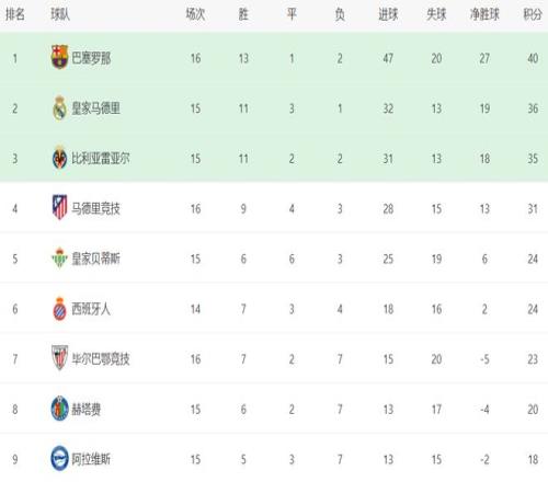 在积分榜上,巴萨战绩是13胜1平2负,以40分高居榜首。皇马紧随其后,拿到36分。皇马比巴萨少踢1轮。第3的是比利亚雷亚尔,拿到35分,只比皇马少1分。输球的马竞依然停留在31分,排名第4,落后榜首的巴萨9分之多。皇家贝蒂斯和西班牙人都是24分,排名第5和第6。 |