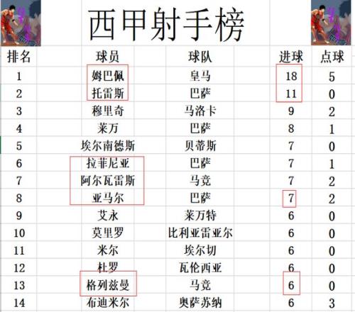 射手榜方面,姆巴佩18球继续稳居榜首,托雷斯今天没有进球,还是11球位列第2。拉菲尼亚点射,亚马尔破门,他们和埃尔南德斯追上阿尔瓦雷斯,四人7球并列第5。格列兹曼打入一球后,则是追上杜罗,莫里罗等人6球刚好挤入前十。 |