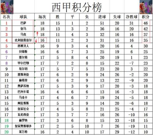 西甲最新积分战报巴萨8连胜再多皇马4分马竞大胜超黄潜冲进前3