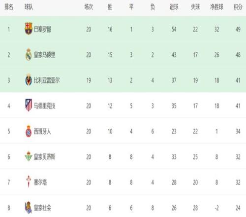 在积分榜上,输球的巴萨依然排名榜首。巴萨的战绩是16胜1平3负,拿到49分。皇马的劣势已经变得很小了,总积分是48分,只落后巴萨1分排名第2。皇马最快下一轮有希望超越巴萨登顶,当然,前提就是巴萨再次丢分。比利亚雷亚尔拿到41分,排名第3。赢球的马竞总积分也是41分,排名第4。西班牙人34分排名第5。 |