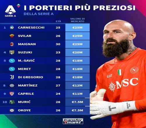 1. 卡尔内塞基(亚特兰大) 2500万欧元 1. 斯维拉尔(罗马) 2500万欧元 1. 迈尼昂(AC米兰) 2500万欧元 4. 铃木彩艳(帕尔马) 2000万欧元 5. 瓦尼亚-米林科维奇-萨维奇(那不勒斯) 1800万欧元 5. 梅雷特(那不勒斯) 1800万欧元 5. 迪格雷戈里奥(尤文图斯) 1800万欧元 8. 何塞普-马丁内斯(国际米兰) 1200万欧元 9. 卡普里莱(卡利亚里) 1100万欧元 10. 穆里奇(萨索洛) 750万欧元 10. 奥科耶(乌迪内斯) 750万欧元 |
