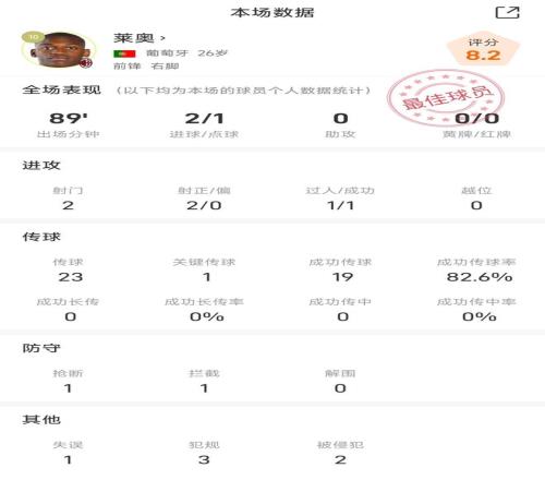 莱奥战佛罗伦萨全场数据:2脚射门打进2球助米兰逆转并登顶