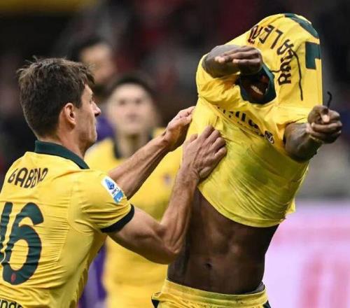 米兰圈 意甲第7轮,米兰2-1佛罗伦萨。 第86分钟莱奥点球破门助米兰反超,之后他想脱衣庆祝,被加比亚拦截。 随后庆祝完,福法纳给莱奥把球衣领子立起来。 |