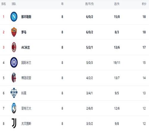 在积分榜上,那不勒斯6胜2负,拿到18分,排名榜首。罗马的战绩和那不勒斯一模一样,但是因为净胜球落后,不得不排名第2。AC米兰5胜2平1负,拿到17分,排名第3。第4的是国际米兰,5胜3负,拿到15个积分。博洛尼亚以14分排名第5。科莫13分排名第6。亚特兰大、尤文图斯和乌迪内斯都是12个积分。拉齐奥赢下这轮之后,总积分升到了11分,排名第10。 |