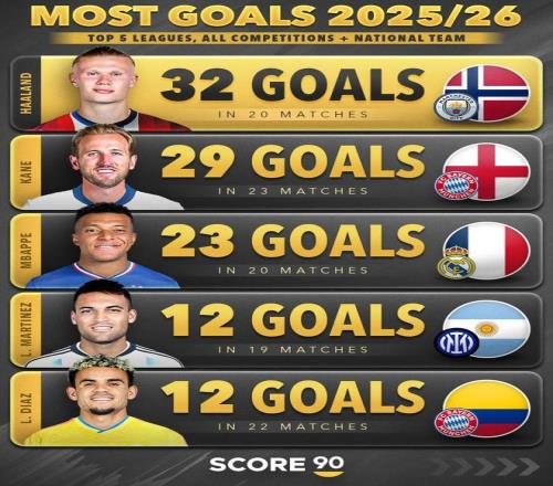 据L'interista报道称,国米将B席列为引援目标。 B席是国米明夏关注的目标之一。根据L'Interista网站的报道,这位葡萄牙中场球员被国米管理层列为关注对象,目的是为姆希塔良找到合适的接班人。 消息来源:斯基拉、L'interista 5 - 本赛季破门数对比的 Score90统计了本赛季五大联赛球员俱乐部+国家队的进球数量,并列出榜单,哈兰德32球居首凯恩、姆巴佩二三位的。
