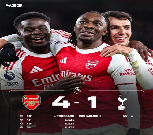 易边再战,埃泽连进2球,上演帽子戏法,热刺则是理查利松的一记超远吊射,打进扳回颜面的一球。 最终,枪手主场4-1大胜热刺,各项赛事15场保持不败。