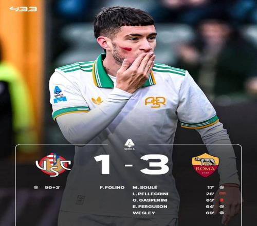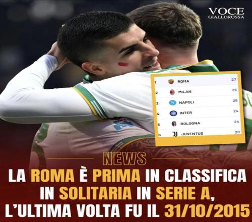 易边再战,罗马主帅加斯佩里尼不满判罚,连吃两张黄牌被罚下,不过之后罗马队凭借埃文-弗格森和利马的进球,3-0领先对手。 主场作战的克雷莫内塞在伤停补时阶段打进一球,最终,罗马客场3-1取胜,登顶意甲积分榜! 时隔3676天!2分领跑意甲 本轮意甲联赛之后,罗马队以2分优势领跑意甲积分榜,而他们上一次在意甲单独领跑已经是10年前。