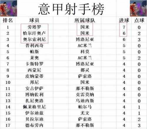 射手榜方面,劳塔罗今天又破门,2轮打入3球的他7球又一次独居榜首。恰尔汗奥卢今天也进球了,他追上奥尔索利尼,两人6球并列第2。普利西奇,帕斯,莱奥5球并列第4,邦尼,伊尔迪兹,卡斯特罗等人则是4球刚好挤入前十。 |