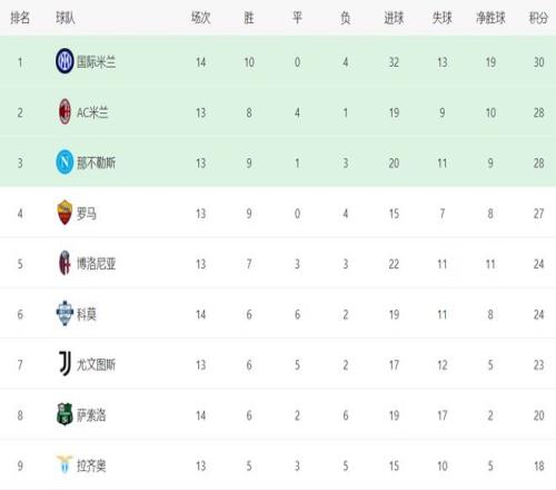 在积分榜上,国际米兰暂时登上榜首位置。国际米兰10胜4负,拿到30个积分。而AC米兰和那不勒斯都是28分,排名第2和第3名。不过,AC米兰和那不勒斯比国际米兰少踢1轮。罗马以27分排名第4。第5的是博洛尼亚,拿到24分。输球的科莫也是24分,排名第6。尤文图斯以23分排名第7。萨索洛20分排名第8。拉齐奥只拿到18分,排名第9。 |