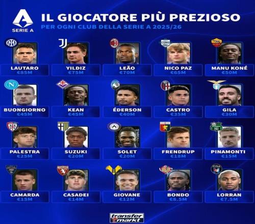 国际米兰 劳塔罗 8500万欧元 尤文图斯 凯南-伊尔迪兹 7500万欧元 AC米兰 莱奥 7000万欧元 科莫 尼科-帕斯 6500万欧元 罗马 夸迪奥-科内 5000万欧元 那不勒斯 布翁焦尔诺 4500万欧元 佛罗伦萨 莫伊塞-基恩 4500万欧元 亚特兰大 埃德松-席尔瓦 4000万欧元 博洛尼亚 圣地亚哥-卡斯特罗 3500万欧元 拉齐奥 马里奥-希拉 3000万欧元 卡利亚里 帕莱斯特拉 2500万欧元 帕尔马 铃木彩艳 2000万欧元 乌迪内斯 索莱-博马沃科 2000万欧元 热那亚 弗伦德鲁普 1800万欧元 萨索洛 皮纳蒙蒂 1500万欧元 莱切 卡马尔达 1500万欧元 都灵 切萨雷-卡萨代伊 1400万欧元 维罗纳 焦瓦内 1200万欧元 克雷莫内塞 邦多 850万欧元 比萨 洛兰 750万欧元 |