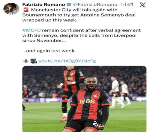 据名记罗马诺的最新消息,曼城将再次与伯恩茅斯谈判,力争在本周敲定塞梅尼奥交易。 “曼城与塞梅尼奥已经达成协议,曼城对此交易充满信心,尽管利物浦从11月就开始接触球员,并且上周再次联系。”