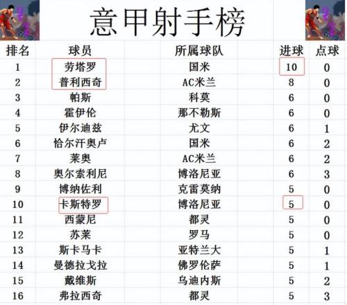 射手榜方面,劳塔罗今天虽然错失了空门,但还是传射建功造2球,他也终于是让意甲本赛季有人进球上双,10球继续领跑。普利西奇8球位列第2,霍伊伦,恰尔汗奥卢,莱奥等人6球并列第3。卡斯特罗打入一球后,追上苏莱,斯卡马卡等人5球刚好挤入前十。 |