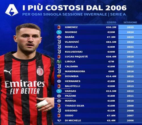 德转列06年至25年意甲冬窗标王:弗拉霍维奇8350万欧第1