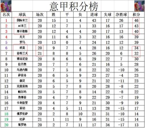 意甲最新积分战报亚特兰大遭保级弱旅绝平无力追上黑马仍第7