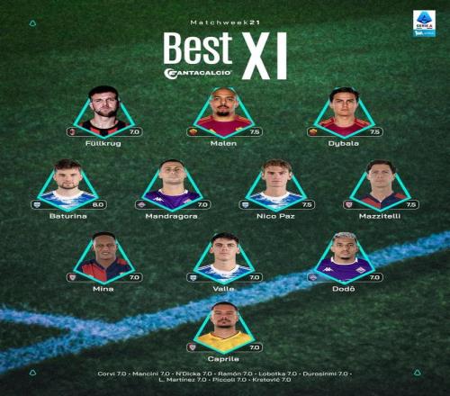 门将 卡普里莱(卡利亚里)7.0分 后卫 多多(佛罗伦萨)7.0分、阿莱士-巴列(科莫)7.0分、米纳(卡利亚里)7.0分 中场 马齐泰利(卡利亚里)7.5分、尼科-帕斯(科莫)7.5分、曼德拉戈拉(卡佛罗伦萨)7.0分、巴图里纳(科莫)8.0分 前锋 迪巴拉(罗马)7.0分、马伦(罗马)7.5分、菲尔克鲁格(AC米兰)7.0分 |