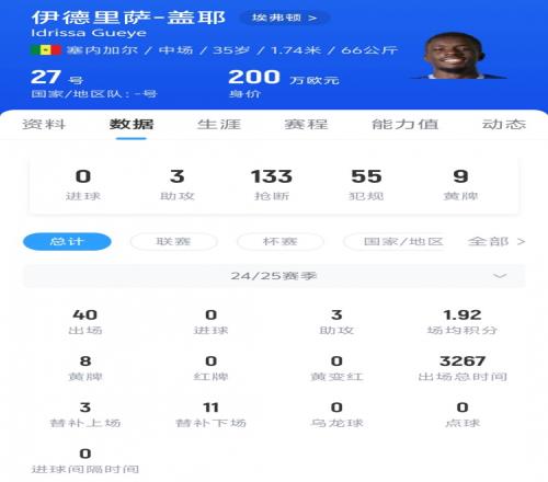 35岁英超抢断第一法媒:埃弗顿接近续约35岁塞内加尔中场盖耶