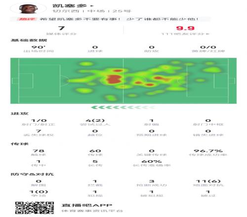 补时阶段受伤!凯塞多本场12对抗6成功3抢断+97%传球成功率