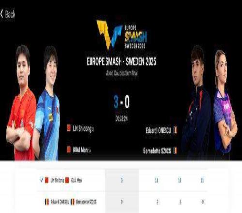 北京时间8月21日,在2025年WTT瑞典大满贯赛混双半决赛中,中国组合林诗栋/蒯曼以11比8、11比5和11比9战胜罗马尼亚组合约内斯库/斯佐科斯组合,晋级决赛。 王曦雨2比0马尔蒂奇,晋级美网女单资格赛决胜轮