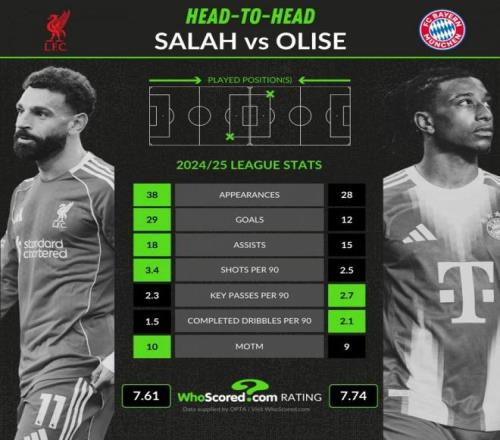 直播吧9月5日讯 有消息透露,利物浦将奥利塞视为萨拉赫的头号替代者人选、前者合同有略低于1亿欧的解约金条款,whoscored也对比了两人上赛季的联赛关键数据。 萨拉赫(利物浦,33岁):38场英超29球18助攻,场均3.4射门、2.3关键传球、1.5成功过人,10次当选全场最佳,场均7.61分 奥利塞(拜仁,23岁):28场德甲12球15助攻,场均2.5射门、2.7关键传球、2.1成功过人,9次当选全场最佳,场均7.74分 |