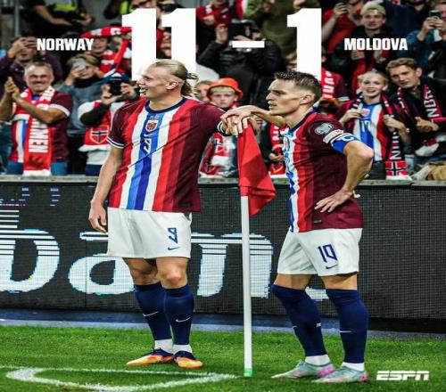 直播吧09月20日讯 世预赛欧洲区I组第6轮,摩尔多瓦队1-11惨败挪威队,哈兰德5球2助。