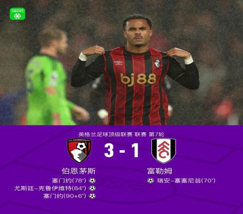 北京时间10月4日,英格兰足球超级联赛第7轮展开角逐,伯恩茅斯坐镇主场迎战富勒姆。比赛中,富勒姆率先打破僵局,丘库埃泽送出助攻,瑞安-塞塞尼翁推射破门。随后,伯恩茅斯逐步掌控节奏,特吕费尔精准传球助塞门约扳平比分。比赛进入尾声阶段,塞门约突破后送出妙传,尤斯廷-克鲁伊维特冷静施射建功,帮助球队反超。伤停补时阶段,本-多克送出关键助攻,塞门约再度破门锁定胜局。最终,伯恩茅斯以3比1逆转战胜富勒姆。