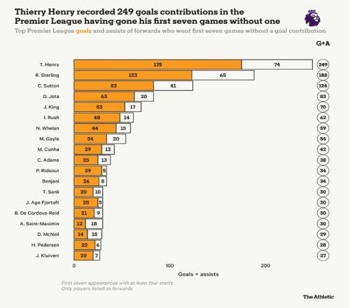 报道称,“007”已经成为足球社交媒体喷子文化中的一种流行嘲讽。它指的是一名新援在为俱乐部效力的前七场连续比赛中没有参与任何进球(进球或助攻)。这种说法的吸引力显而易见:形式简洁,又与虚构的间谍詹姆斯-邦德联系在一起。 维尔茨是最新一个被“007”盯上的目标,他在英超的起步较为缓慢。利物浦今年夏天以1.16亿英镑(1.563亿美元)从勒沃库森签下的维尔茨,在英格兰顶级联赛的前七场比赛中既没有进球也没有助攻。 试图与那些认真使用“007”的人讲道理,就像试图说服曼联主教练阿莫林放弃他的3-4-2-1阵型一样:纯粹是浪费时间。但解释为什么“007”如此荒谬仍然有一定的价值。 桑乔的早期挣扎仍在继续,但历史表明,许多开局七场英超比赛没有贡献的球员最终成为了备受赞誉的球星。 共有75名前锋(为了公平起见,我们排除了中场和后卫)达到了“007”的标准(在他们的前七场比赛中至少首发四次),下表列出了英超总进球参与数排名前20的球员。