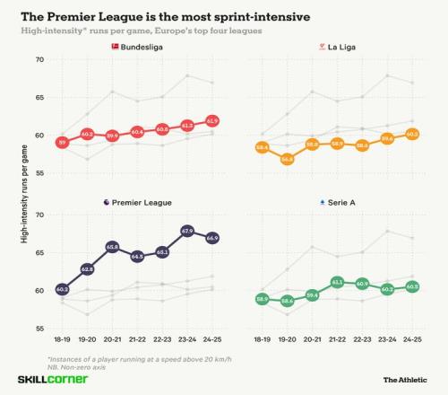 假如社交媒体在1999年就存在,那一年亨利——当时只有21岁,比现在的维尔茨还小几个月——从尤文图斯转会到阿森纳,他同样会遭受网络暴力。然而,他最终证明了自己相当出色:175个英超进球,74次助攻。 再往下看名单,我们会发现库尼亚,他在2023年从马德里竞技转会至狼队后,初期也难以适应。在克服了这些初期问题并在狼队逐渐崭露头角后,库尼亚表示:“这是世界上最好的联赛,所以稍微难一点,适应起来需要更多时间,但现在我更有信心了,感觉更适应联赛了。” 适应英超的强度是新援们经常提到的挑战,数据也支持这一点。 SkillCorner的追踪数据显示,每场比赛,英超中的高强度跑动(速度超过每小时20公里/12.4英里)次数比西班牙、德国和意大利的顶级联赛更多。