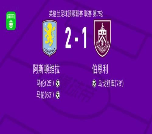 维拉21伯恩利,马伦梅开二度,乌戈舒库破门
