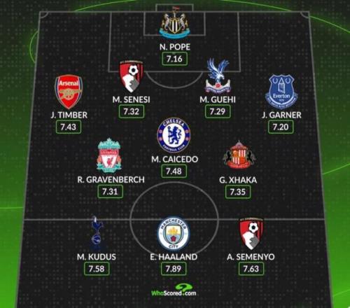 门将:波普 后卫:廷伯、塞内西、格伊、加纳 中场:赫拉芬贝赫、凯塞多、扎卡 前锋:库杜斯、哈兰德、塞梅尼奥 消息来源:WhoScored 5 - 格伊也许会去到其他赛事 据天空体育记者Kaveh Solhekol社媒,在免签格伊的竞争中,皇马、巴萨和拜仁比利物浦更有优势他会思考加入这些豪门的机会。