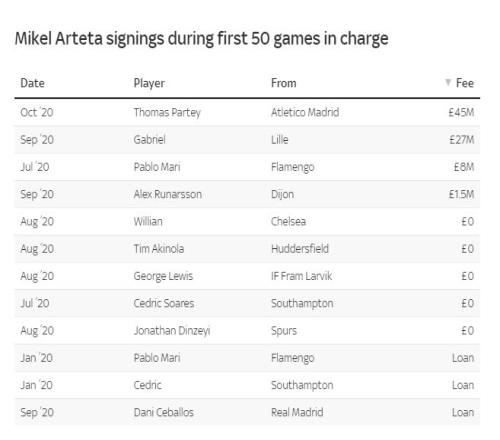 转会支出 阿森纳的转会支出近些年以来有所增加,夏窗达到了创纪录的2.57亿英镑。然而,在阿尔特塔执教的前50场比赛里,俱乐部的支出更为谨慎,主要依靠租借和自由转会,两个转会窗口仅仅投入了8150万英镑。托马斯和加布里埃尔是仅有的两位以高额转会费加盟的球员。