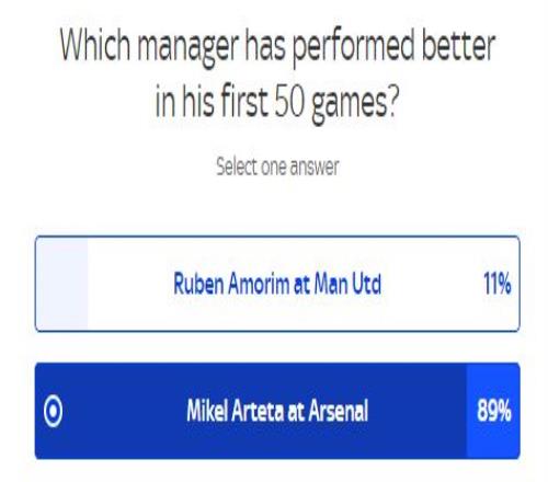 阿莫林难复刻塔帅 《天空体育》的调查显示,89%的球迷认为阿尔特塔执教阿森纳前50场时更加成功,只有11%的球迷认为阿莫林更成功。 同时,65%的球迷认为阿莫林未来无法在曼联取得成功,只有35%的球迷认为阿莫林会取得成功。 |