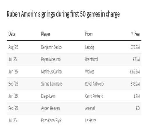 在阿莫林执教之后,曼联签入的球员较少,但转会费更高,塞斯科、姆贝莫、库尼亚、拉门斯等球员的转会费高达2.32亿英镑,明显超过了阿尔特塔执教时的同期费用。 在出售球员方面,在阿尔特塔执教的前50场时,阿森纳仅仅只得到了1700万英镑的转会费,当时马丁内斯转投维拉。曼联则收入更高,加纳乔、安东尼的转会费达到了6170万英镑。