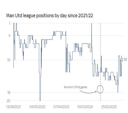 在阿尔特塔执教的第一个完整赛季,阿森纳排名第8位,而在他执教的第50场比赛里,阿森纳在酋长球场0比3负于利物浦,排名第9位,只比阿莫林执教50场之后在英超的排名高一位。