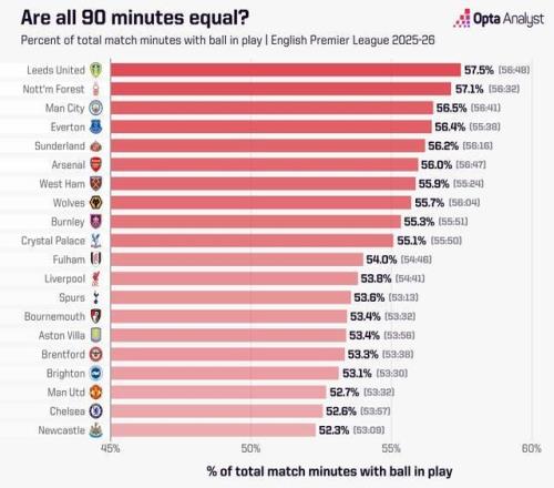 截至目前(70场比赛后),本赛季英超场均有效比赛时间为正好55分钟,比上赛季的56分59秒少了近两分钟,比2023-24赛季少了三分钟多(58分11秒)。 你可能会以为这只是补时时间变短了,但事实并非如此。数据显示,本赛季英超比赛的总时长(包括补时)为100分35秒,是有记录以来第二长的赛季,仅次于2023-24赛季(101分36秒)。 换句话说,本赛季比赛比上赛季平均多持续了51秒(去年为99分44秒),但球真正处于比赛状态的时间却减少了将近两分钟。 这意味着,每场比赛中平均有2分50秒的额外“无球时间”——大约就是听完约翰-特拉沃尔塔和奥利维亚-纽顿-约翰合唱的《You’re the One That I Want》所需的时间。 总体来说,本赛季英超比赛的非比赛暂停时长平均为45分35秒(上赛季为42分45秒),几乎相当于一集英国节目《Countdown》的时长。我们本可以看完一场文字游戏节目,却在现实中看着球员慢悠悠走去发角球。 纽卡斯尔本赛季比赛中球在场上实际运行的时间比例是英超最低的,仅为52.3%(平均每场53分9秒),紧随其后的是切尔西(52.6%)和曼联(52.7%)。不过,这一数据很可能与对手的比赛方式有关,而不完全是这些球队自己总在“拖时间”。 不过话说回来,有一场比赛的确在很大程度上拉低了纽卡斯尔的整体数据。纽卡斯尔在英超第2轮对阵利物浦的那场5球大战,是本赛季球在场上实际运行时间最少的一场比赛——这一点颇为惊人,因为整场比赛一共持续了109分24秒,是2025-26赛季英超所有比赛中时间第三长的。 造成这种情况的主要原因之一,是比赛中的犯规次数。主裁判西蒙-胡珀当晚共判罚了31次犯规,这也是本赛季英超单场第二多的记录。全场比赛用于主罚任意球的累计延迟时间高达27分07秒,比本赛季任何其他英超比赛都多出了约7分半钟。 纽卡斯尔每次任意球平均耗时达67秒,比本赛季前7轮所有英超球队单场平均任意球用时至少多10秒。 这也导致下半场补时长达13分43秒,为本赛季英超单场最高。尽管如此,全场球在场上实际运行的时间仅为45分55秒(42%)。换句话说,在圣詹姆斯公园球场,这场比赛中有63分29秒的时间里什么都没发生。事后回想,比赛居然还打进了5个球,其中包括利物浦球员的压哨绝杀,确实令人难以置信。 紧随其后的是切尔西主场1比3不敌布莱顿的比赛,那场比赛总时长为105分14秒,但球在场上实际运行的时间只有46分44秒,占比44.4%。 【上咪咕独家看英超】 |