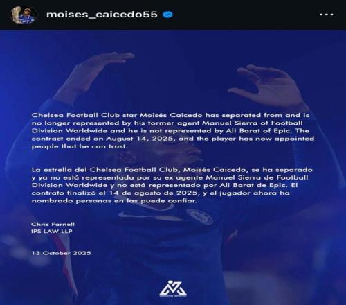 早些时候,凯塞多在社交媒体上发表动态,宣布与经纪人解除合作关系。 凯塞多在社交媒体上发表动态,其中写道:“凯塞多已经与他的前经纪人曼努埃尔-西耶拉(Manuel Sierra)分道扬镳,不再由Football Division Worldwide代理。” “现在,他也不再由Epic的阿里-巴拉特(Ali Barat)代理。合同于2025年8月14日结束,目前球员已经任命了他信任的人来代表自己。” 不过随后,他删除了这一条动态,根据记者金塞拉的报道,凯塞多现在由家人提供顾问支持,不再聘请正式的经纪人。 这是他长期的计划,在通过两家经纪公司分别转会至布莱顿和切尔西后,他决定实施这一方案,之前的帖子因措辞不当已删除,但他对之前的经纪人并无恶意。 【上咪咕独家看英超】 |