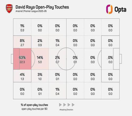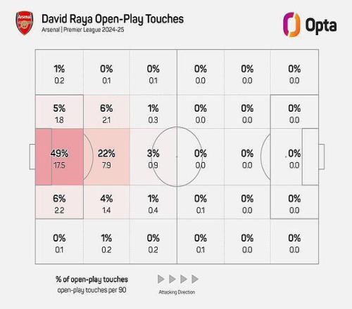 据传,2023年4月阿森纳争冠希望破灭时,阿尔特塔目睹拉姆斯代尔开场30秒内将球直接传给南安普顿的对手,那一刻他意识到自己需要一名能够传球的门将。 拉亚小时候曾想踢外场位置,并在距离巴塞罗那童年家仅两分钟步行路程的五人制足球场上磨练了他的技术。 某种程度上,阿尔特塔也希望拉亚能扮演外场球员的角色。他需要一个能够发起进攻、能在对方前锋之间送出穿透性传球到中场,并在阿森纳控球时充当额外中后卫的门将,从而在面对高压逼抢的对手时占据人数优势。 拉亚在这方面至关重要。自上赛季开始以来,没有哪位英超门将在开放比赛中的持球参与序列中比阿森纳的拉亚更多。也没有哪位门将比他更频繁地发起这些进攻回合。他总是参与其中,而且经常是那个发端之人。 他经常在自己的禁区深处完成这些操作。对于一位常因战术不够冒险而受到批评的主帅来说,他确实要求自己的门将承担一定风险。 拉亚经常持球等待,诱使对手上前逼抢,然后才将球传给边后卫或中场球员。 上个月阿森纳1-1战平曼城的比赛中,拉亚在本方禁区内接到传球,持球不动超过10秒,直到哈兰德上前逼抢才将球传给赖斯。随后他又接回赖斯的传球,再次等待10秒才继续传递。 拉亚经常这样做。他会站在原地,用鞋钉压住球。他时常假装要向一侧传球,然后又停下,引诱对手靠近,再将球传出。 与两年前对阵曼城的第四次联赛首发相比,他现在做这些动作时更加自信。当时他在一次角球中手忙脚乱,队友不得不在门线上解围,随后又被阿尔瓦雷斯逼抢,险些丢球。 那是拉亚阿森纳生涯的早期阶段,他的每一次失误都会让镜头转向替补席上的拉姆斯代尔。在那次阿尔瓦雷斯的逼抢后,加里-内维尔评论道:“一眼就能看出哪个门将是紧张得不知所措——就在你面前。他完全没有思路,反应也不够快,真是非常幸运。” 如今,拉亚已经有了清晰的思路和十足的信心。本赛季他较少上前充当后防线的一员,而是更愿意在更深的位置接球,从那里开始组织进攻——无论是短传还是长传。尽管承担风险,但他自2024年4月以来未曾因失误导致对手进球。 上赛季拉亚在开放比赛中触球区域分布图 本赛季的数据,显示他上前充当后防球员的频率降低,在本方禁区深处大量掌控比赛节奏。