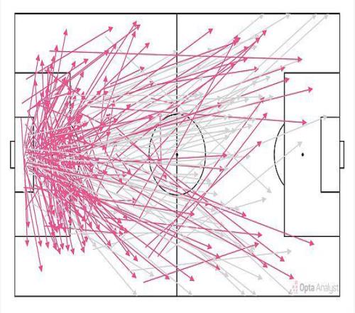 拉亚之所以对阿森纳的比赛如此重要,是因为他传球的多样性。他可以短传给边后卫或中场球员,同时也有能力在球队需要时送出精准长传。 正如克洛普在2021年布伦特福德一场比赛中目睹拉亚精彩传球表现后所说:“他们的门将应该背上10号球衣,看看他送出的那些传球。” 随着阿尔特塔逐渐向英超新趋势靠拢——直接打法,尤其是有了速度快的锋线尖刀哲凯赖什和善于冲击防线的新援埃泽与马杜埃凯——拉亚的长传球出现得更加频繁。 但多样性才是关键,这一点可以从拉亚本赛季的英超传球图中看出。 拉亚本赛季尝试了多种传球方式,必要时送出长传(成功传球用彩色标注,未成功传球用灰色标注)。 拉亚在开球时更加直接。本赛季他近90%的开球都超过了40码。只有三支升班马的门将比他更频繁地使用这种策略。一切为了尽早让萨卡拿球。