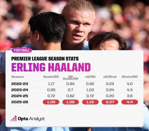 以下为具体排名情况: 1、凯恩(拜仁):11球 2、哈兰德(曼城):9球 3、姆巴佩(皇马):9球 4、阿尔瓦雷斯(马竞):6球 5、塞梅尼奥(伯恩茅斯):6球 据Opta统计,哈兰德本赛季每90分钟射门、进球等数据创造英超生涯新高。 消息来源:Squawka、Opta |