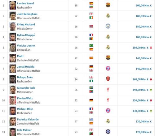 其中亚马尔2亿欧身价领衔,贝林、哈兰德、姆巴佩均1.8亿欧紧随其后。