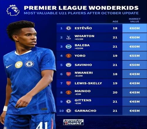 英超U21球员身价榜: 1、埃斯特旺(切尔西,18岁):6000万欧 亚当-沃顿(水晶宫,21岁):6000万欧 巴莱巴(布莱顿,21岁):6000万欧 4、约罗(曼联,19岁):5500万欧 5、萨维尼奥(曼城,21岁):5000万欧 6、恩瓦内里(阿森纳,18岁):4500万欧 刘易斯-斯凯利(阿森纳,19岁):4500万欧 梅努(曼联,20岁):4500万欧 吉滕斯(切尔西,21岁):4500万欧 加纳乔(切尔西,21岁):4500万欧 消息来源:德转 4 - 他会来这 据《太阳报》报道,意大利名帅曼奇尼已告知其朋友,他认为自己有机会成为曼联下一任主教练的候选人,前提是俱乐部解雇现任主帅阿莫林。