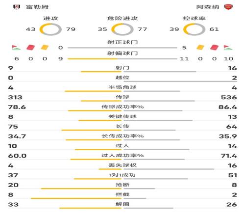 阿森纳10富勒姆全场数据:射正次数50,控球率超6成