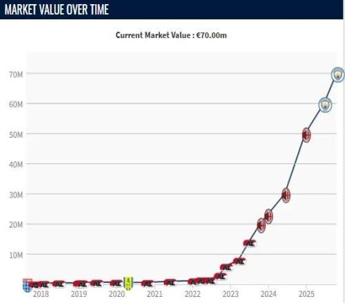 今夏以5500万欧转会费加盟曼城的赖因德斯,身价上涨1000万至7000万欧。 赖因德斯身价曲线↓
