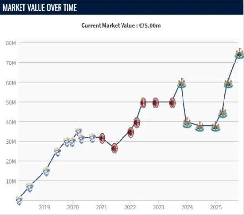 米兰圈 德转更新英超球员身价,两名前米兰中场托纳利和赖因德斯身价均迎来上涨。 现效力纽卡的托纳利身价上涨1500万至7500万欧,成为意大利身价第二高的球员,仅次于8000万欧的巴斯托尼。 托纳利身价曲线↓