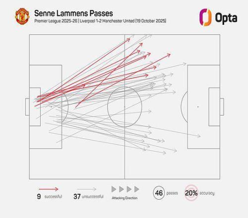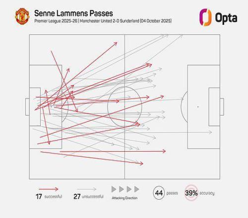 不过,让我们先明确一点:曼联确实踢得很直接。非常直接。 他们全场294次传球中,超过四分之一是长传。相比之下,他们在输给布伦特福德的比赛中,仅有不到10%的传球是长传;即便是在战胜桑德兰的比赛中,尽管采用了更直接的打法,这一比例也只有13%。 在安菲尔德球场,曼联门将森内-拉门斯几乎将所有46次传球中的44次都直接长传出去。面对利物浦前场压迫如此凶猛的球队,试图从后场组织进攻无异于自找麻烦。 但更有趣的是,阿莫林在赛前就暗示会采用这种打法,并提到赢得第二落点的重要性,但他却把身高达到1米95的前锋谢什科放在了替补席上,首发派出了芒特、库尼亚和姆伯莫的三叉戟。 按照阿莫林的说法,利物浦中后卫科纳特和范戴克擅长争顶高空球并解围,所以曼联必须找到其他办法。 那么,为什么尽管如此,曼联还是比以往更加依赖长传?因为他们这次的方式与对阵桑德兰时略有不同。看看森内-拉门斯的传球分布图就知道了。 对阵桑德兰时,这位曼联门将很乐意将大部分长传球直接开向中路,让谢什科去争抢并与桑德兰的中后卫对抗。 然而,对阵利物浦时,他的大部分传球都是瞄向边路或通道区域。只有五分之一的传球找到了曼联球员,但这并不重要。客队预计会输掉大多数头球争顶,但这给了阿莫林的球队更多机会在己方翼卫能够快速与锋线配合的区域赢得第二落点,从而利用速度和跑位撕裂利物浦的防线。 而这正是他们所做的。