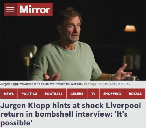 克洛普在作客The Diary of a CEO节目接受采访时暗示,他不排除未来重返利物浦执教! 克洛普目前担任红牛全球足球主管,而在被问到未来重返英超执教的可能性时,德国人表示:“我曾说过自己不会再执教另一支英格兰球队,所以这意味着,假如我重返英格兰,那么只会执教利物浦,是的,理论上来说有这个可能性。 怎样我才会重返安菲尔德?我自己甚至都不清楚,我热爱自己目前的工作,我并不怀念执教,我不怀念在雨里站上两个半小时或者三个小时,我也不怀念每周三场新闻发布会。 我执教了1080场比赛,我可不想噶在更衣室里。 今天我是否需要决定未来不再重返帅位?谢天谢地我不需要这么做,未来怎样看看再说吧。”