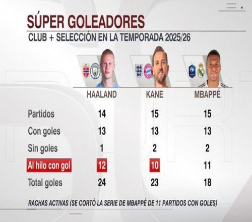 欧冠联赛阶段第三轮,哈兰德、凯恩延续了连场进球的纪录,而姆巴佩则停留在11场。