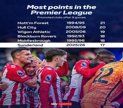 桑德兰9轮17分升至第二,英超历史升班马联赛同期积分第6多